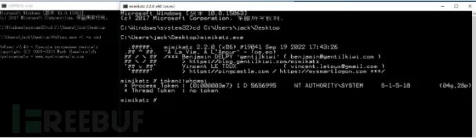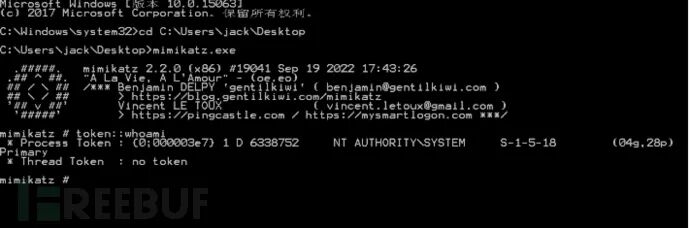 域内主机上已经登录一个普通域用户hack\jack,其具有本地管理员权限。以本地管理员权限打开一个cmd窗口,运行mimikatz.exe执行如下的命令,使得mimikatz.exe当前进程具有System权限