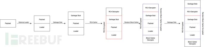 Shoggoth可以生成一个输出文件,并以经过模糊处理的形式存储Payload及其相关的加载器。由于输出的内容是与位置无关的,因此我们也可以直接将其作为Shellcode来执行。当Payload正在执行的时候,它会在运行时对自己进行解密。除了加密程序之外,Shoggoth还添加了一些垃圾指令,这些指令在不同程序之间不会做任何的数据修改操作。