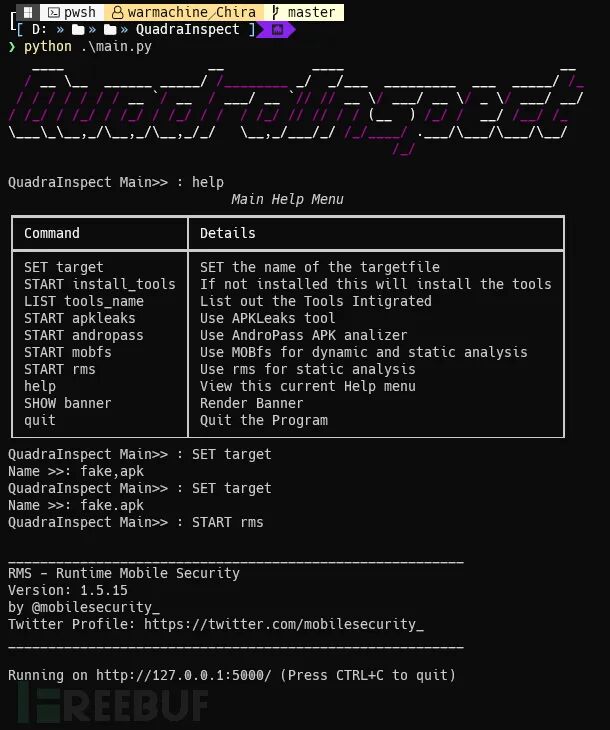 QuadraInspect是一款功能强大的Android应用程序安全分析框架,该工具整合了AndroPass、APKUtil和MobFS(RMS)工具,并提供了非常强大的Android应用程序安全分析功能。AndroPass是一款专注于分析Android应用程序身份验证和授权机制安全性的工具,而APKUtil是一种从APK文件中提取有价值信息的工具。最后,MobFS和RMS通过将应用程序的存储安装在虚拟环境中,方便了对应用程序文件系统的分析。