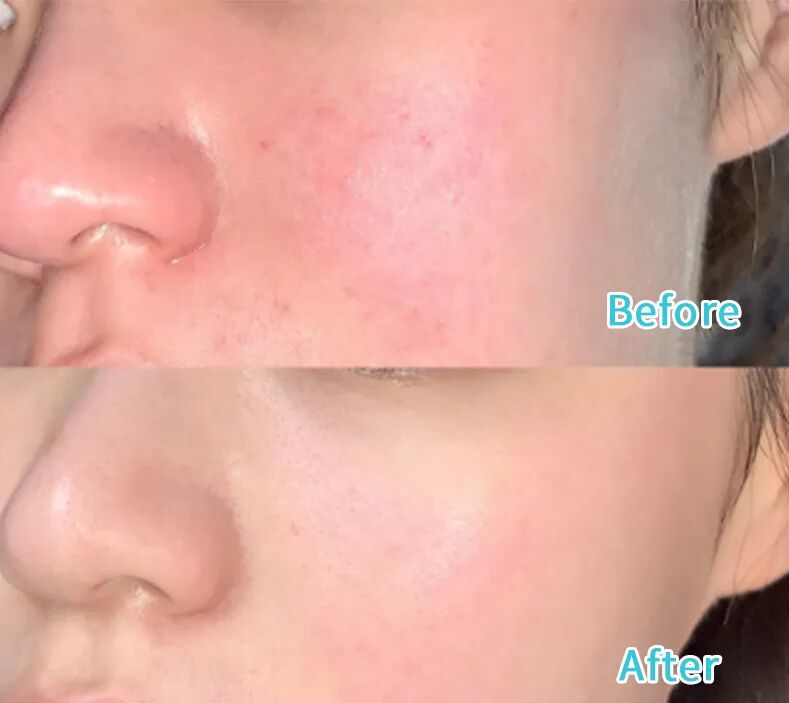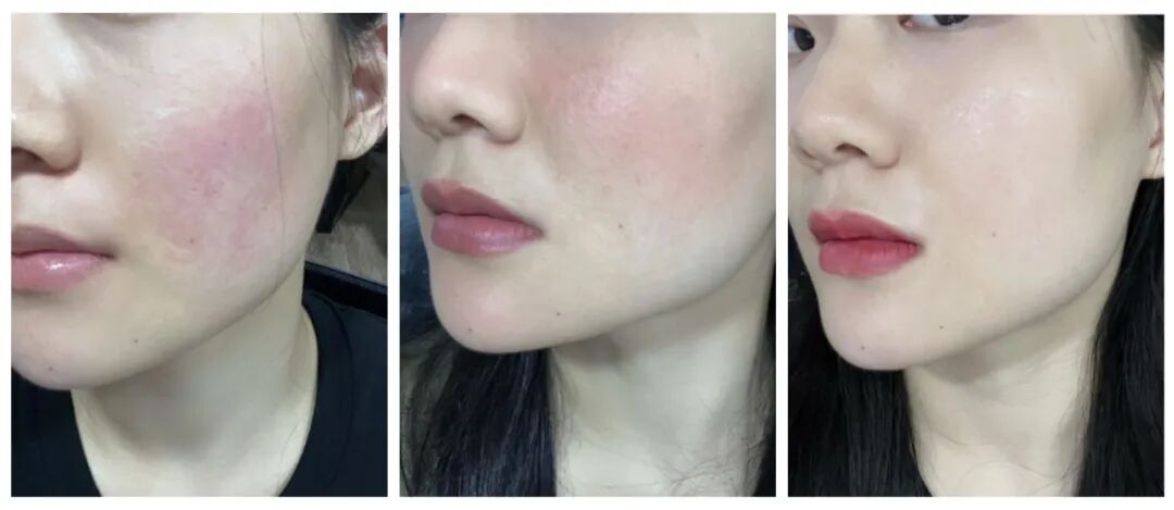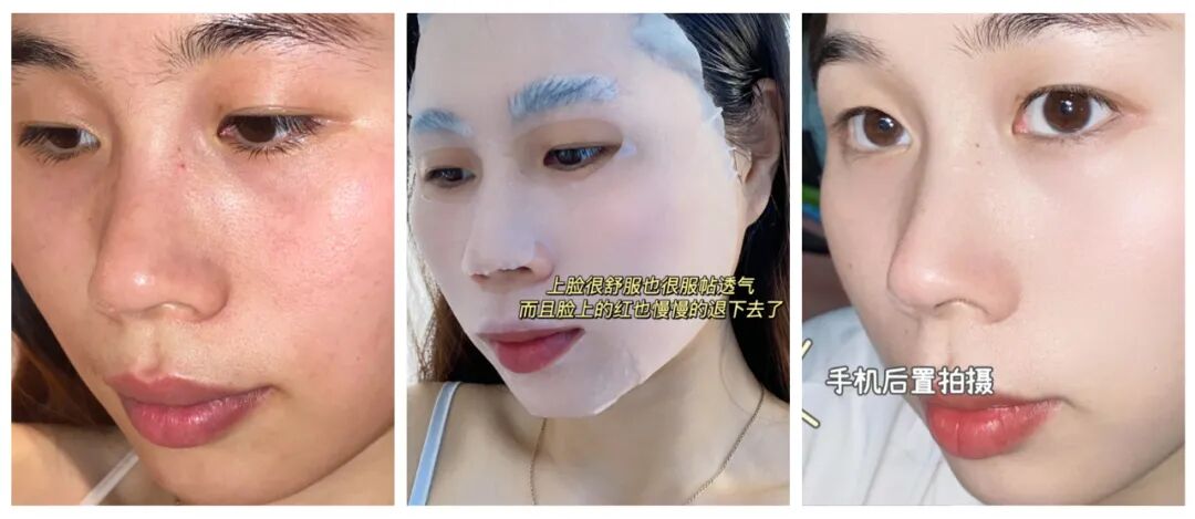 用荣晟敷15分钟后,脸上的泛红被压下去好多,仿佛没被晒过一样。