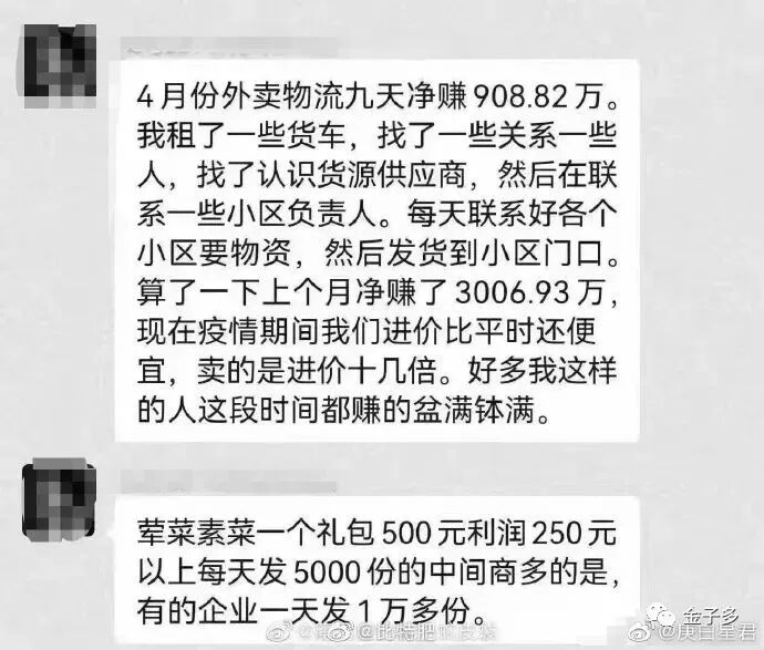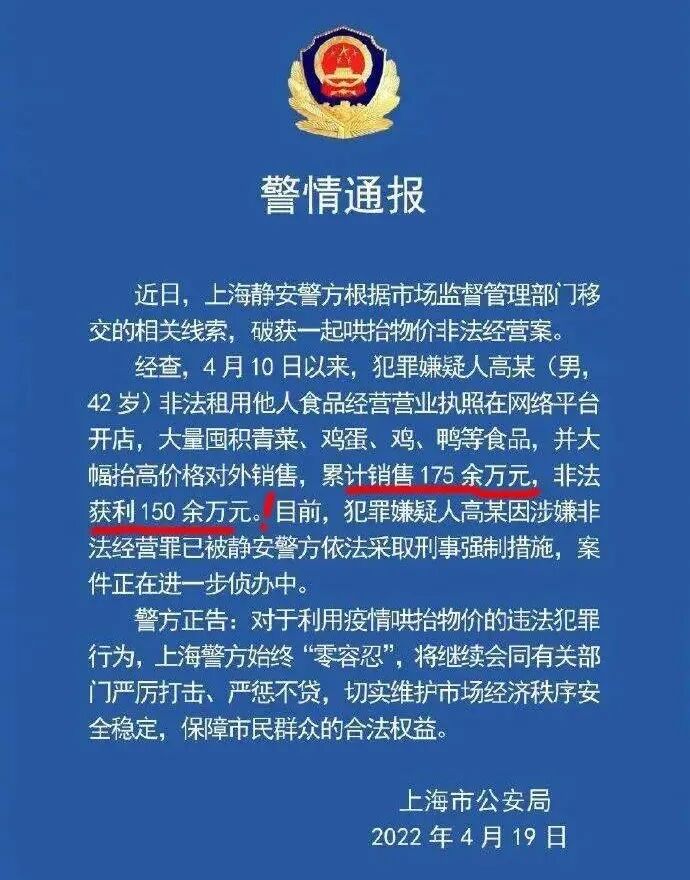 也就是说,上海咨谕实业有限公司根本就不具备食品保供资质。原来这家公司,是一家实缴资本为零,参保人员为零的空壳公司!问题来了,这样一家没有冷藏冷冻食品经营资质的公司,为何能堂而皇之的进入保供名单?警方调查发现,4月9日,上海咨谕实业有限公司和梅龙镇的《保供协议》签订合同,采购金额为760余万元。犯罪分子用300万低价买入有问题的“黑心肉”,然后作为生活保障物资配送给梅龙镇居民。是谁批准这家公司进入保供名单的?又是谁做的质检?难道不应该好好查一查这背后的故事?上面的新闻,利润还只是100%而已,大上海还有更疯狂的事情!嫌疑人高某大量囤积青菜、鸡蛋、鸡、鸭等食品,然后高价出售。不知道的还以为这是发生在解放前。谁料想,竟然发生在21世纪的上海滩。一旦有适当的利润,资本就胆大起来。如果有10%的利润,它就保证到处被使用;有20%的利润,它就活跃起来。有50%的利润,它就铤而走险;为了100%的利润,它就敢践踏一切人间法律;有300%的利润,它就敢犯任何罪行,甚至冒绞首的危险。深圳封城时,为何物资供应及时?为何没有高价菜?为何城市井井有条?这次疫情,全国各地响应“一方有难,八方支援”,对上海进行饱和式支援。一方边是平价菜难以派送,一边是“天价菜”却畅通无阻。经济学上有句术语叫“劣币驱逐良币”,如今,在上海,天价菜正在驱逐平价菜。君不见,菜价胜过LV的背后,发国难财者月入3千万!