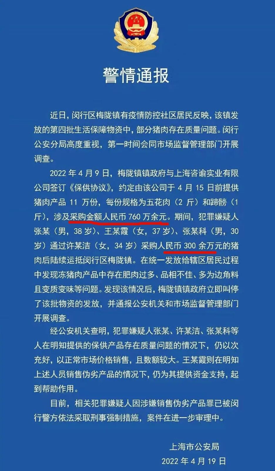 点蓝色字关注“金子女侠”+星标作者/金子女侠 (ID:jinzicaijing) 4月15日网友爆料,上海梅陇镇发放的猪肉存在严重质量问题。![]()