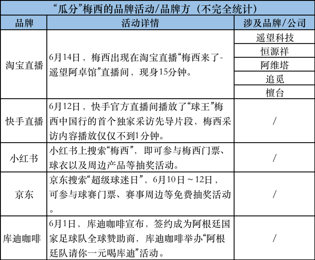 6月14日,梅西出现在“梅西来了-遥望阿卓馆”淘宝直播间,比此前预告的时间提前了4个小时。或许因为匆忙,直播看起来有些粗糙:画面多次卡顿、现场翻译声音盖过了梅西的声音;现场幸运粉丝合影环节,被突然掐掉的直播界面......这些都让球迷疯狂吐槽。一个多小时的直播中,主播李宣卓多次口播提醒,“梅西出现在直播间时,本场直播的任何商业元素和梅西先生无关。”然而,这场提前预热且引起不少传播的直播,共引来250w人观看,梅西仅出现了15分钟。在这15分钟内,直播间的屏幕上方几次出现了品牌商的logo,包括恒源祥、阿维塔、追觅、檀台4家。此前,据《中国企业家》从接近阿维塔的人士中了解到,阿维塔此次是和“梅西来了淘宝直播间”的合作。据《福布斯》杂志公布的足球运动员2022年收入排行榜,梅西以1.2亿美元位居第二位,品牌价值为1.7亿美元。其中,梅西的工资奖金收入6500万美元,商业收入5500万美元。2021年梅西的代言费用为3500万美元。本次梅西中国行,官方赞助商达23家。据“2023足球冠军行”公众号显示,赞助商包括国宾酒业、京东、小红书、伊利、小米等。据了解,该公众号的认证主体就是本次活动的主办方“中国虹桥国际投资有限公司”。而据社交媒体上流传的一张“梅西中国行”赞助商刊例价格,本次梅西中国行,赞助商分为四档,从100万元到1000万元不等。其中顶级合作伙伴设1席,拥有从比赛现场到晚宴的各种露出权益,开价1000万;一级官方合作伙伴共设5席,开价400万。据蓝鲸报道,本次活动主办方负责招商的工作人员,确认了网传刊例价格的真实性。12日,一张梅西将来淘宝直播的海报流传出来。海报文案上写着14日晚,梅西将来淘宝直播,在遥望旗下主播李宣卓的直播间和粉丝线上互动。据每日经济新闻报道,这也将是此次梅西中国行中,唯一与粉丝互动的机会,淘宝直播将作为独家平台进行直播。消息发出后,遥望科技当天股价收盘涨幅5.13%。快手紧随其后,发布了梅西将要出现在快手直播间的消息称,梅西12日晚19点将要出现在快手直播间,梅西独家采访先导片将在快手上线。据了解,直播直到30分钟时,梅西出现,回答了主持人一个有关欧冠决赛的问题,大约1分钟后又消失在直播间。据《中国企业家》了解,当晚梅西正在北京奥体中心的鸟巢体育场训练。《中国企业家》根据公开资料整理。制表:胡楠楠
