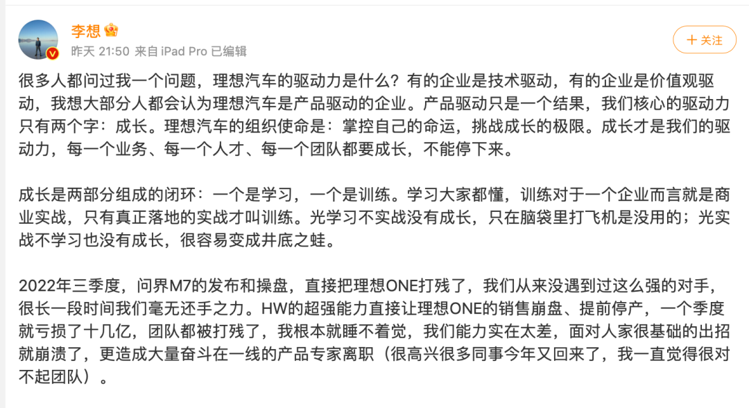 他指出,理想汽车的核心驱动力,不是技术,不是价值观,也不是产品,而是“成长”。