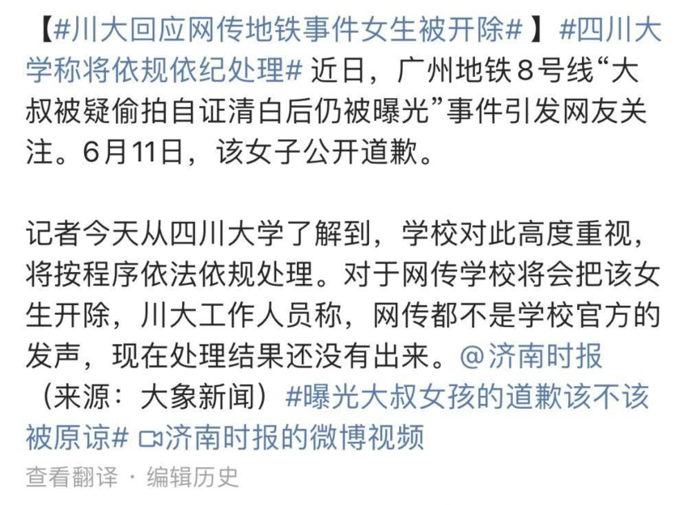 据新浪科技报道,腾讯已解除川大地铁女生实习合同,进入离职流程。(图片来源:微博)