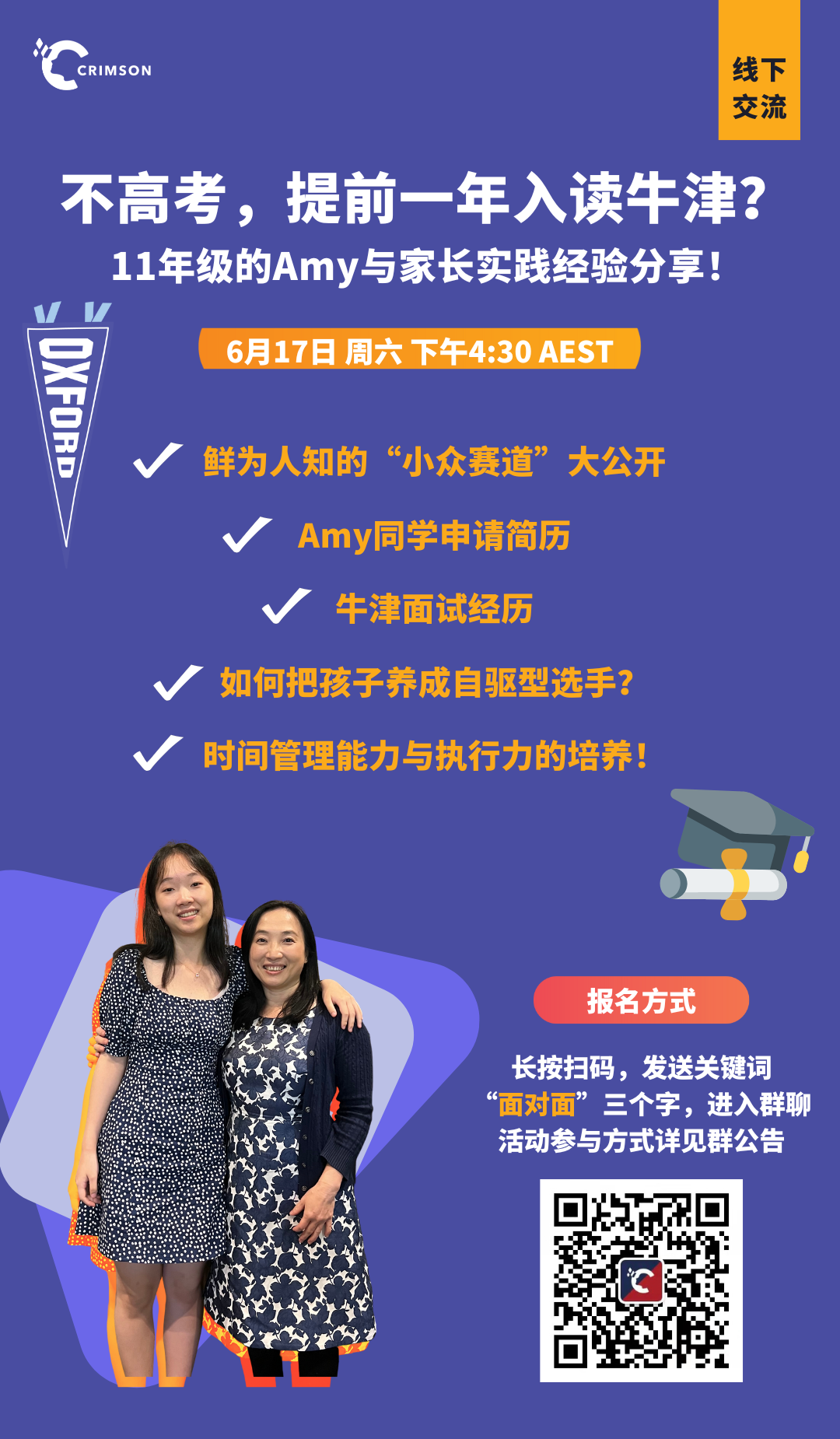 之前的线上分享后,收到了许多家庭的积极反馈。Amy和妈妈Tina的分享,条理清晰,干货十足,给家长和同学们带来诸多启发。诚挚的邀请您和孩子共同参加 6月17日 星期六 下午4:30 AEST在悉尼举行的面对面交流活动。一起探索如何培养自驱力、塑造自律习惯、建立良性亲子互动和创造学习氛围的方式。(报名方式见文末)想要为孩子提供最佳的学术支持和科学规划吗?想让您的孩子像Amy一样提前一年进入牛津大学?在下周六的面对面活动中,我们将与您分享如何培养孩子们的自驱力。了解如何激发孩子们的好奇心、深度探索能力;如何培养好奇心,主动追求和拓展兴趣。