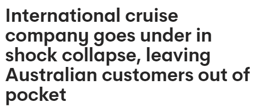 由于该邮轮公司破产倒闭,澳洲顾客一共损失了460万澳元,而新西兰顾客则损失了150万澳元。