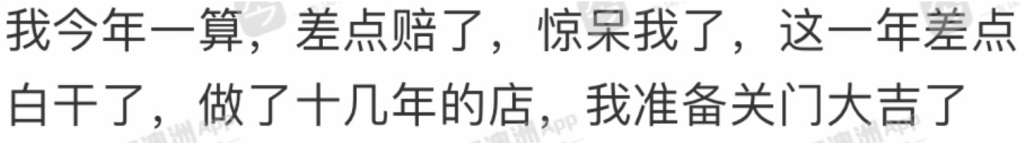 也有老板称,“我今年一算,差点赔了”,且“做了十年的店,准备关门大吉”。