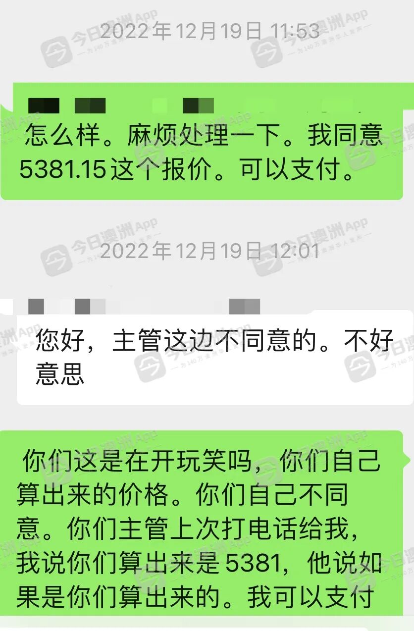 稍后,客服表示计算有误,撤回3个报价并再次计算,以减免40%为考量,最终得出的金额为$7000澳元,但杨先生拒绝接受。