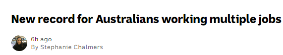 这意味着现在大约每15个澳洲人中,就有1人从事一份以上的工作,这是自上世纪90年代有记录以来的最高比例。