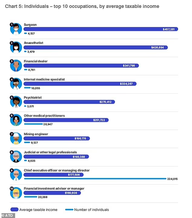外科医生的应税收入最高,为457,281澳元,其次是麻醉师,为426,894澳元。