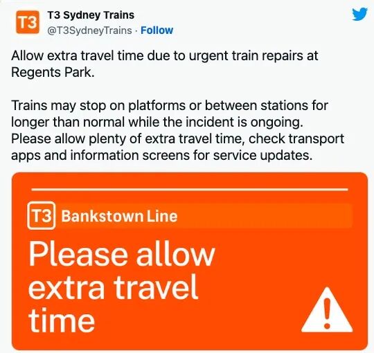 乘客被警告要预留最多20分钟的额外出行时间,并检查时刻表,因为一些服务可能会改变站点。据悉,乘坐内西区和Bankstown Line的通勤者也面临延误,因为在上午8点前,Regents Park的火车开始紧急维修。
