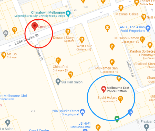 地图中红圈处为小A一行被抢处,蓝圈处为东墨尔本警局,两处地点直线距离仅50米