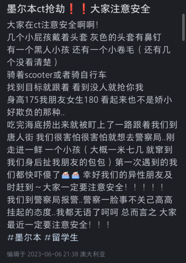 “虽然没有丢东西,但还是希望大家一定要注意安全,最近尽量不要拿包出门,”她告诉今日澳洲App记者。