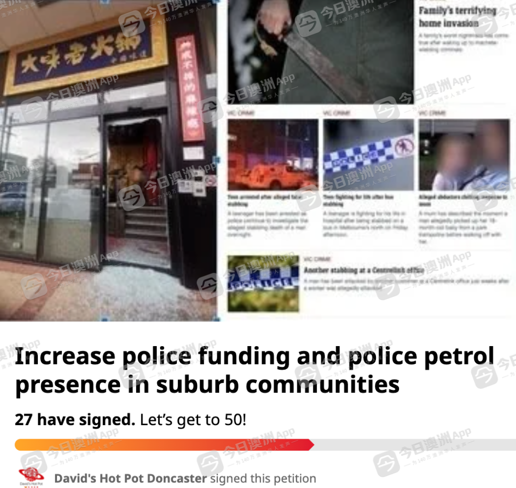 他在请愿信中说,“曾经被评为地球上最宜居城市的墨尔本,因公共安全问题而失去了声誉。我们需要看到政府解决犯罪问题的实际成果,而不仅仅是一些空洞的承诺。”
