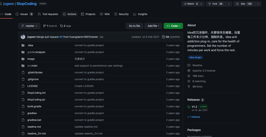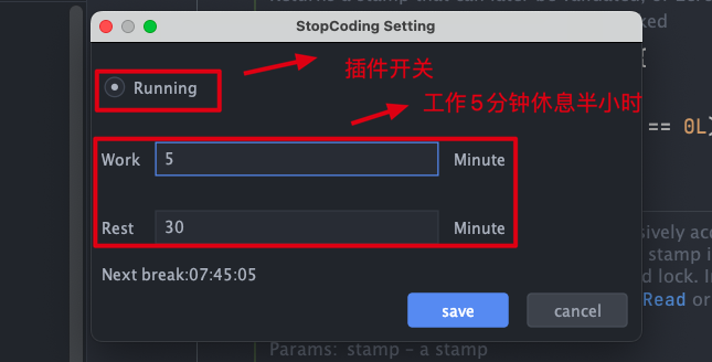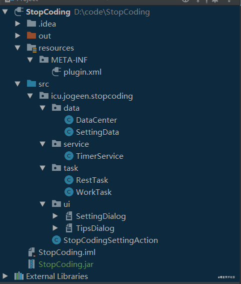 试过用手机提醒自己,但是没用。小米手环的久坐提醒功能也开着,有时候写代码正入神的,时间到了也就点一下就关了,还是没什么作用。所以我想究竟是我太赖了,还是用 IDEA 写代码容易沉迷,总之不可能是改需求有意思。所以元旦节打算为自己开发一款小小的 IDEA 防沉迷插件,我叫她【StopCoding】。她应该可以设置每隔多少分钟,就弹出一个提醒对话框,一旦对话框弹出来,IDEA 的代码编辑框就自动失去了焦点,什么都不能操作,到这还不算完,关键是这个对话框得关不了,并且还显示着休息倒计时,还有即使我修改了系统时间,这个倒计时也依然有效,除非我打开任务管理器,关闭 IDEA 的进程,然后再重新启动 IDEA。但是想一下想,IDEA 都都关了,还是休息一下吧。
