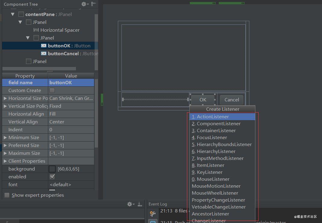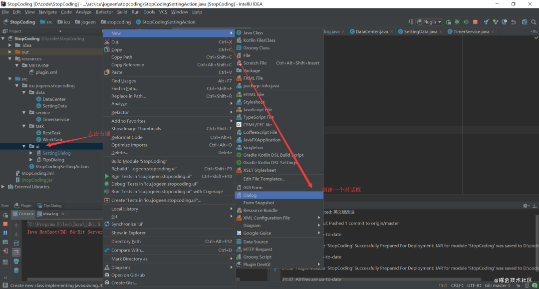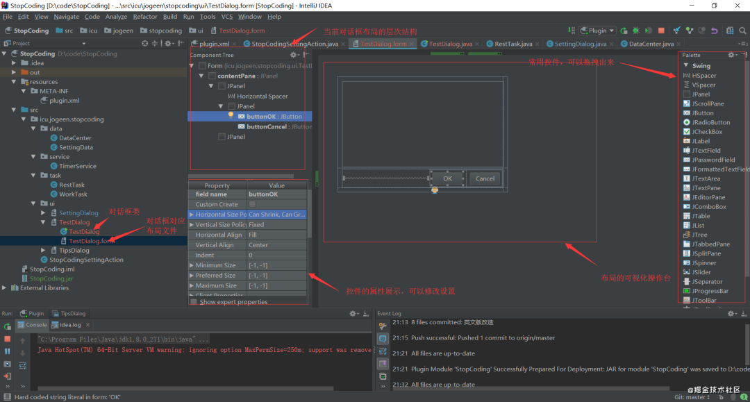 SettingData :配置信息对应 modelDataCenter :作为运行时的数据中心,都是些静态的全局变量TimerService :这个定时计算的核心代码RestTask :休息时的定时任务WorkTask :工作时的定时任务SettingDialog :设置信息的对话框TipsDialog : 休息时提醒的对话框StopCodingSettingAction :启动入口的 action其实在 IDEA 中开发 Swing 项目的界面非常简单。因为 IDEA 提供了一系列可视化的操作,以及控件布局的拖拽。接下来就简单的介绍一下对话框的创建过程和添加事件。