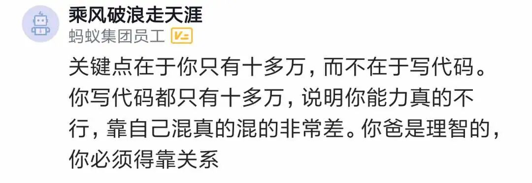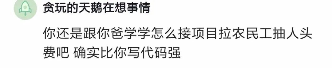 有人说,楼主写代码只挣十几万,说明能力真的不行,只能靠关系。还是跟爸爸学学怎么接项目、拉农民工、抽人头费吧。