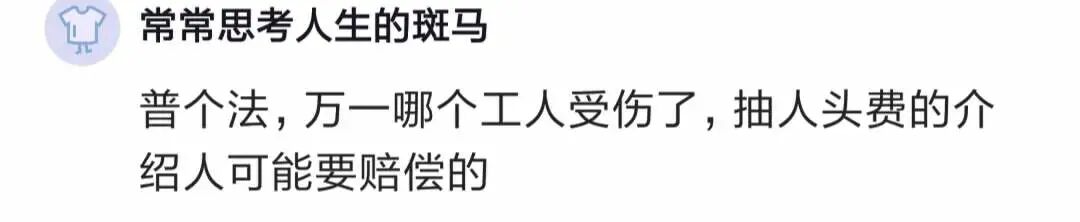 有人说,如果有工人受伤,抽人头费的介绍人还要赔偿。