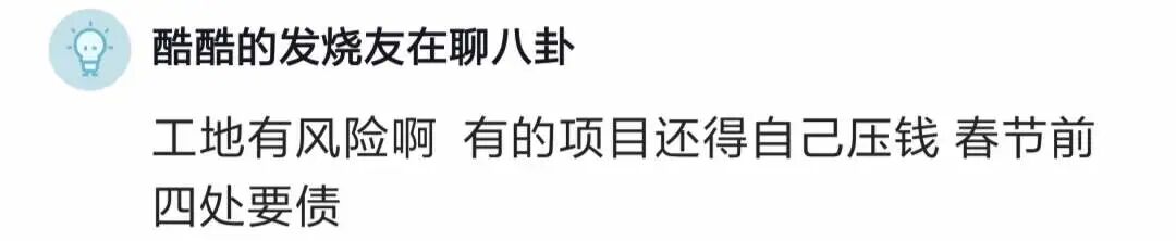 还有许多网友觉得工地也没有那么好干,为了拿工程喝酒喝到吐,追款很难,春节前四处要债,还要自己往项目上压钱。