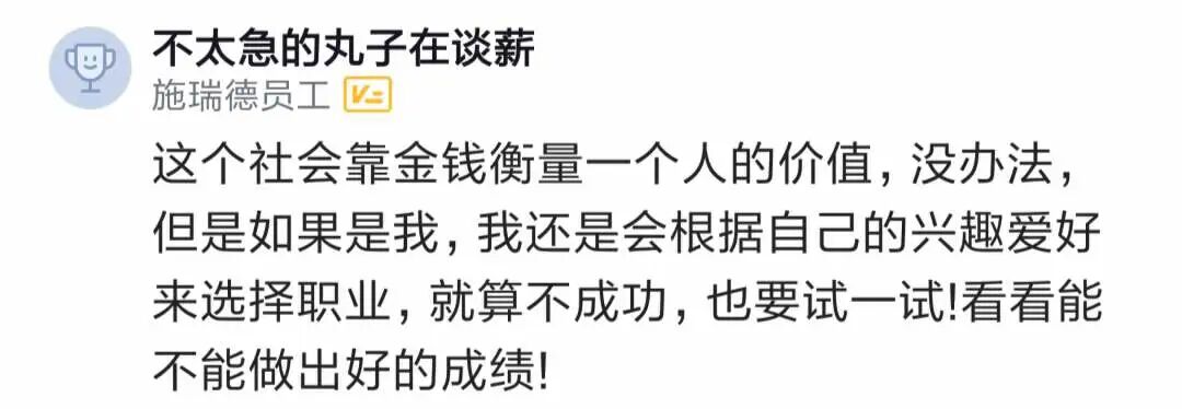 也有人说,这个社会靠金钱衡量人的价值,但自己还是会根据兴趣爱好来选择职业,就算不成功,也要试一试。人生是自己选择的,理想是需要坚持的。