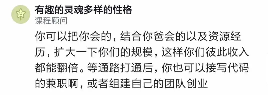 有人说,可以把自己会的和爸爸的资源经历结合一下,打通通路后,也可以接写代码的兼职,或者组建自己的团队创业。