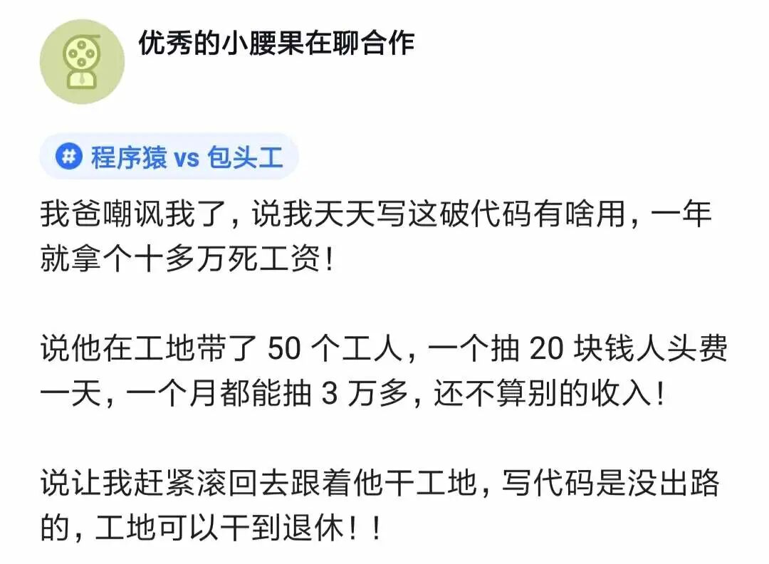放在几年前,可能许多人会毫不犹豫地选择“写代码”,在互联网行业鲜花着锦、烈火烹油的那些年,进大厂写代码是一份体面又高薪的工作。而工地给人的感觉则是苦、累、脏,只有低学历的人才愿意去做这样的工作,即使包工头不直接从事体力劳动,年轻人也不愿意做。但这几年互联网行业大不如前,码农早已不复往日光鲜,跟包工头比起来,真的很难说哪个是更优选。