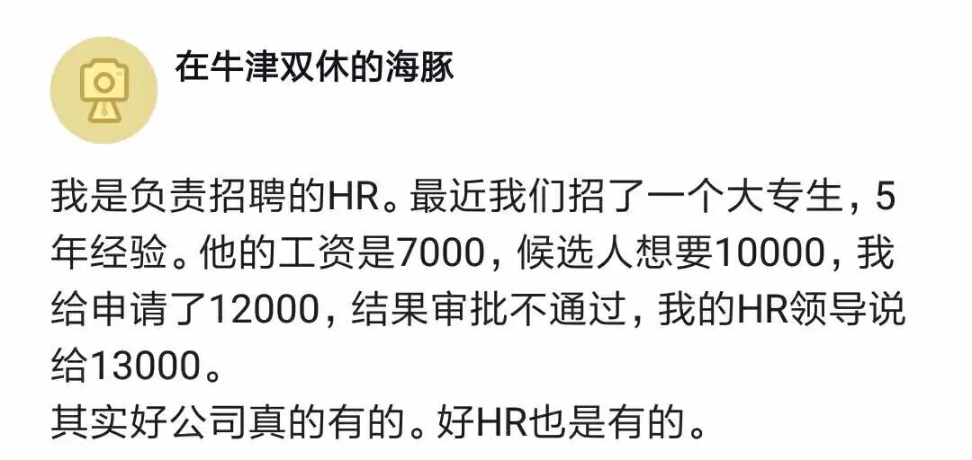最近我们招了一个大专生,5年经验。他的工资是7000,候选人想要10000,我给申请了12000,结果审批不通过,我的HR领导说给13000。