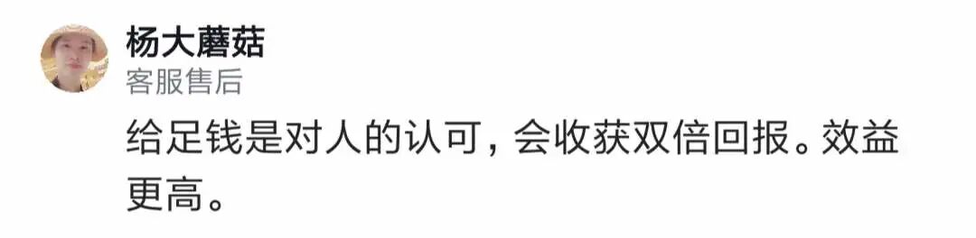 有人说,那个候选人进去以后,干活的热情一定很高。给足钱是对人的认可,会收获双倍回报,效益更高,这种能量不是金钱绩效能买到的。