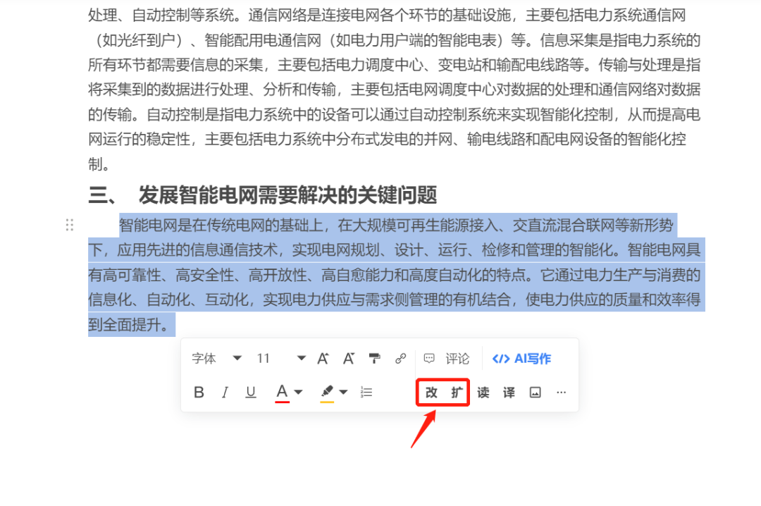 他还特别为我们提供了扩写、改写等实用功能,如果你对某一段落不满意,你可以选中对应的文字,针对原文进行扩写、改写等,一直改到你满意为止。