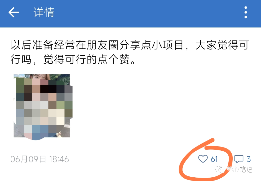 然后我在我的几个号上发了条朋友圈,说准备分享项目,想看项目的点赞。