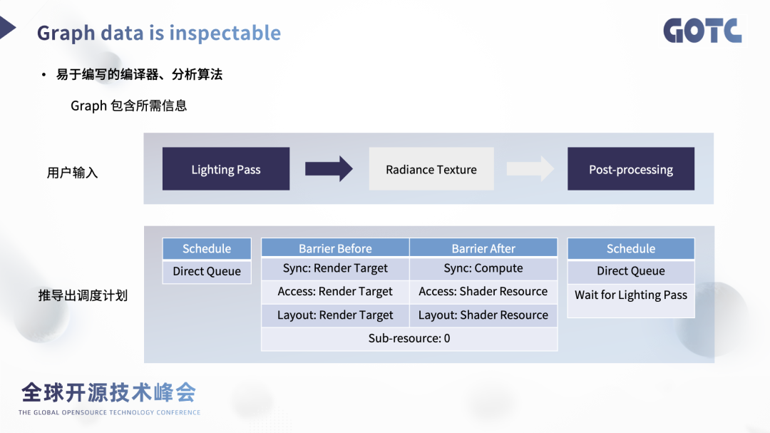 我们还会做一些自动化的推导来完成渲染的执行,用户不需要去手动插入一些资源变换的 Barrier 或者同步工作。