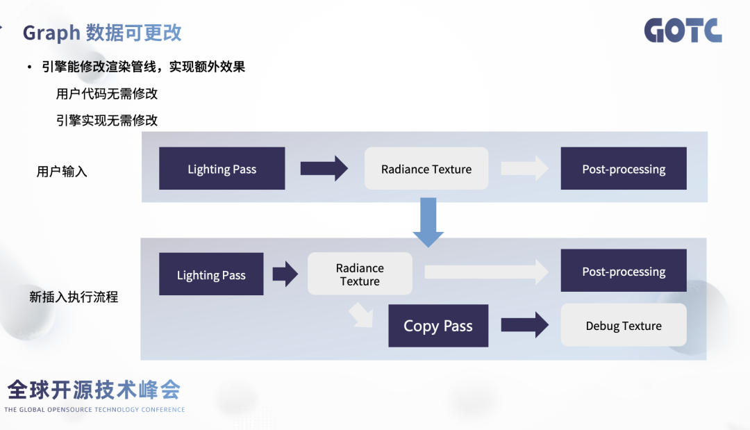 用户输入我们可以直接插入一些新的执行流程,比如说插入拷贝的 Pass,把一些光照的结果或者说绘制的结果拷贝,渲染到画面上。这样的流程,用户是没有感知的,也不需要编写额外的代码,可以提升用户开发的体验。
