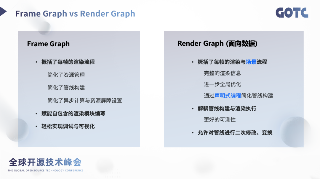 开发方式方面,传统的 Frame Graph 是用户通过编写回调函数来完成渲染环境的构建,用户将编写构建的代码,传给 Frame Graph 组件,再提交给硬件进行渲染。在此同时去调用用户的 C + + 的回调来进行控制反转。