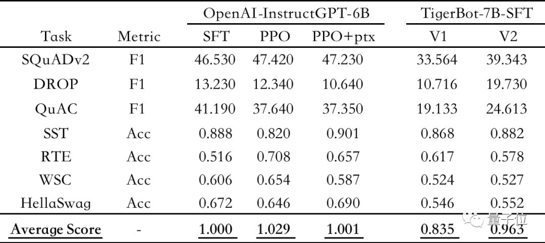 根据OpenAI InstructGPT论文在公开NLP数据集上的自动评测,TigerBot-7B已达到 OpenAI 同样大小模型的综合表现的96%。