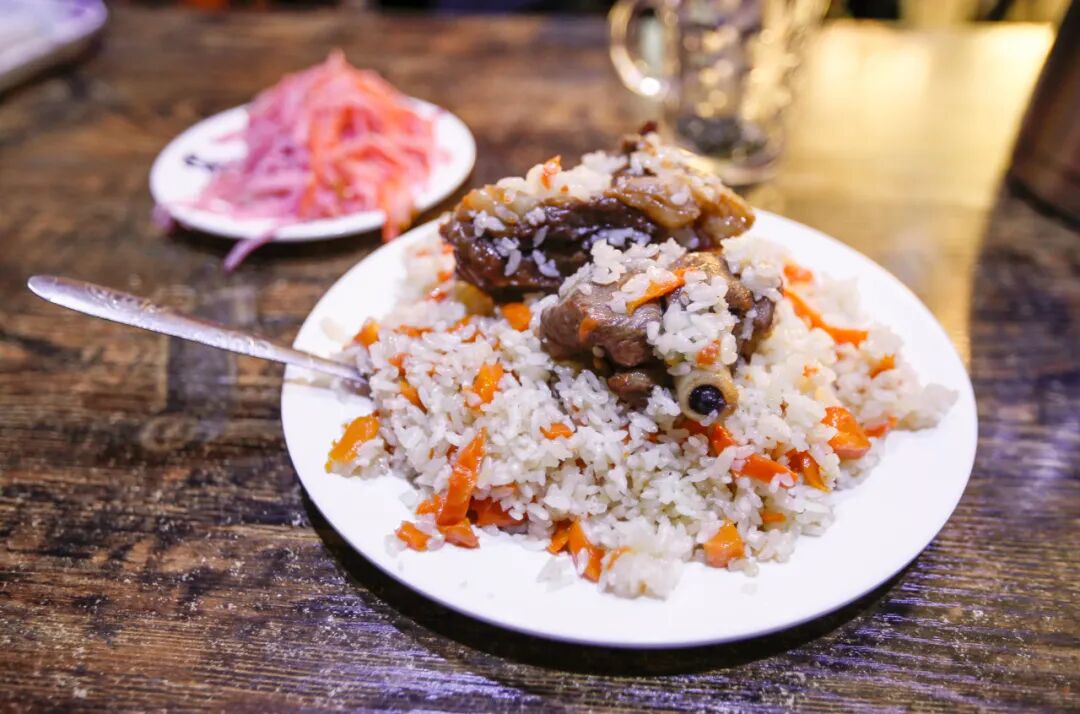 智慧的新疆人创造了有菜有肉有饭一锅出的手抓饭,再配上解腻小菜,唇齿留香。
