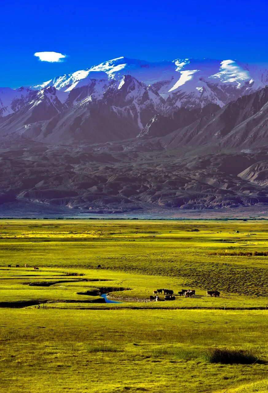 塔什库尔干河流经此处,使得这里水草丰美,牛羊遍地,和远处的雪山白云蓝天交融在一起十分漂亮。