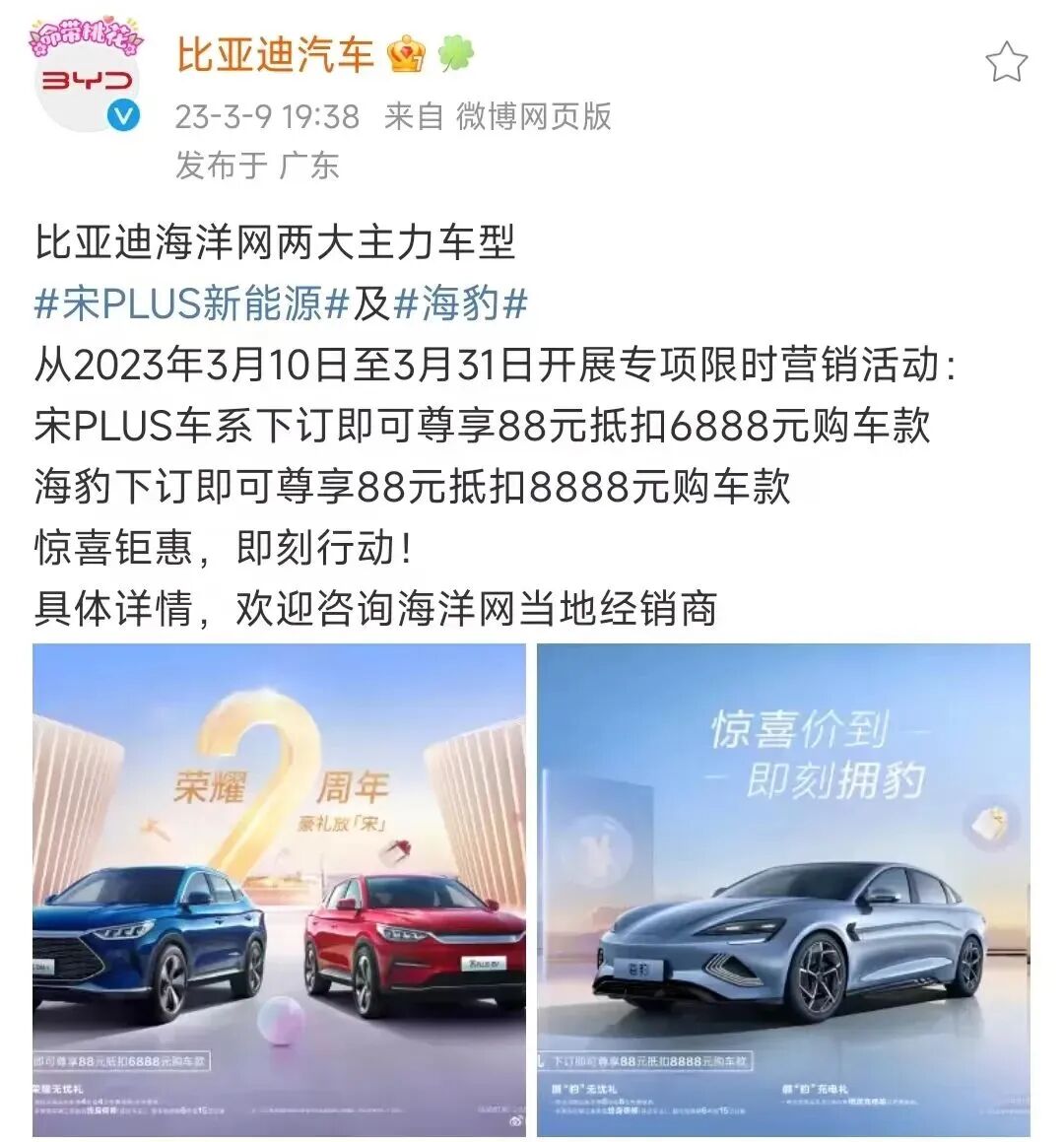 作为国内自主车企之一的比亚迪也紧随其后,先是在今年2月基于秦PLUS DM-i车型,推出了升级版冠军车型,在配置升级的同时售价却降了1.2-1.8万元。次月,再对宋PLUS新能源和海豹两款车型开展专项限时优惠活动,最多可抵扣8888元购车款。