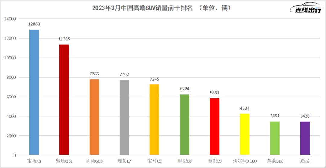 2023年3月中国高端SUV销量前十排名,数据来源于乘联会,连线出行制图