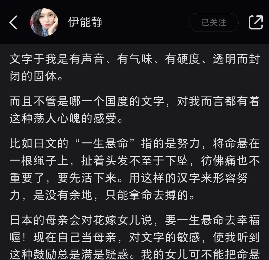 她最近还给女儿写了一段话,不要“一生悬命”地去幸福。来自一句日语,她自己翻译的就很美,