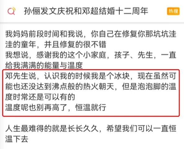 先说一个最近的热搜,关于孙俪。她没有什么让人“突然让人心一惊”的新闻,就是结婚纪念日了,发表了一段感想。