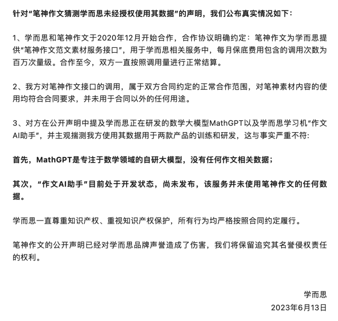 https://modelscope.cn/models/baichuan-inc/baichuan-7B/summary昨日下午,学而思发布关于“笔神作文猜测学而思未经授权使用其数据”的声明。根据声明,学而思和笔神作文2020年12月开始合作,并明确约定笔神作文为学而思提供“笔神作文范文素材服务接口”,学而思对笔神作文接口的调用属于合同约定正常合作范围。笔神作文猜测学而思使用其数据用于数学大模型MathGPT以及学而思学习机“作文AI助手”与事实不符。首先,MathGPT是专注于数学领域的自研大模型,没有任何作文相关数据;其次,“作文AI助手”目前处于开发状态,尚未发布,该服务并未使用笔神作文的任何数据。