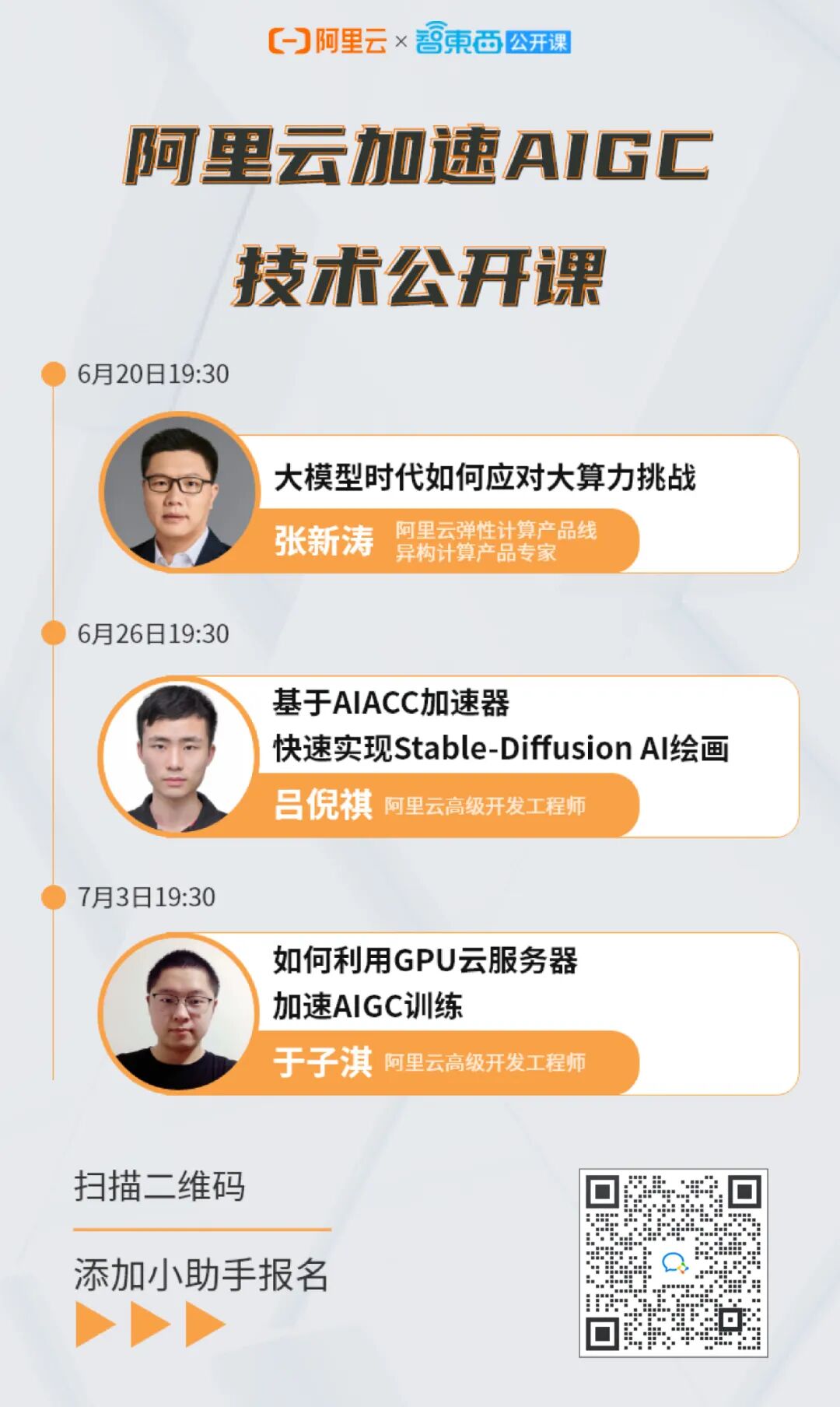 为此,智东西公开课联合阿里云弹性计算团队共同出品「阿里云加速AIGC技术公开课」,阿里云弹性计算产品线异构计算产品专家张新涛、阿里云高级开发工程师吕倪祺、阿里云高级开发工程师于子淇三位技术专家将先后进行直播讲解。