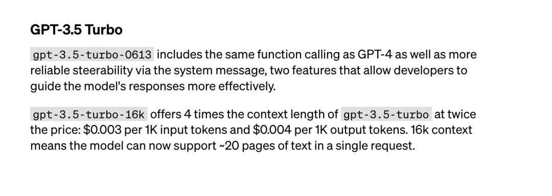 除了函数调用功能之外,OpenAI 还发布了gpt-3.5-turbo-16k模型。此前,由于使用者输入的文字内容过长,生成式AI模型往往会“忘记”一部分人机对话窗口的内容,从而导致生成的内容偏离主题,而GPT-3.5-turbo解决了该问题。据悉,新版GPT-3.5-turbo支持16000 tokens的上下文长度,比目前的 gpt-3.5-turbo要长4倍,而且使用者仅需高于普通GPT-3.5-turbo两倍的价格。简单来讲,使用者输入1000个tokens需要支付0.003美元,模型生成1000个tokens,使用者需要支付0.004美元。![]()