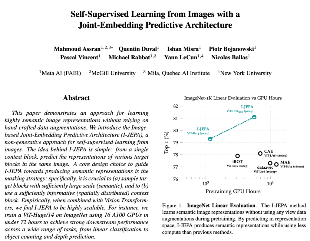 智东西6月14日报道,今日凌晨,Meta宣布推出首个“类人(human-like)”AI模型I-JEPA。这是第一个基于Meta首席AI科学家杨立昆(Yann LeCun)愿景关键组成部分的AI模型,据称能比现有模型更准确地分析和完成未完成的图像。在上周举办的背景智源大会上,杨立昆在发表致辞演讲时斗志昂扬地驳斥了GPT的逻辑,说自回归模型没有规划、推理的能力,单纯根据概率生成自回归的大语言模型从本质上根本解决不了幻觉、错误的问题,并给出了他认为的正确答案——世界模型。杨立昆去年提出了一种新的架构,旨在克服当今最先进的AI系统的关键限制。他的愿景是创造出能够学习世界如何运作的内部模型的机器,这样它们就可以更快地学习,计划如何完成复杂的任务,并随时适应不熟悉的情况。基于LeCun愿景关键组成部分,今日发布的图像联合嵌入预测架构(I-JEPA),通过创建外部世界的内部模型来学习,该模型比较图像的抽象表示(而不是比较像素本身)。I-JEPA在多个计算机视觉任务上提供了强大的性能,并且比其他广泛使用的计算机视觉模型的计算效率高得多。I-JEPA学习的表示也可以用于许多不同的应用程序,而不需要进行大量的微调。例如,Meta研究人员在72小时内使用16个A100 GPU训练了一个拥有6.32亿个参数的视觉Transformer模型,并且它在ImageNet上实现了最先进的少样本分类性能,每个类只有12个标记示例,其他方法通常需要2到10倍以上的GPU时,并在使用相同数量的数据进行训练时获得更低的错误率。I-JEPA相关论文将在下周的CVPR 2023上发表,训练代码和模型检查点的源代码已开放。![]()