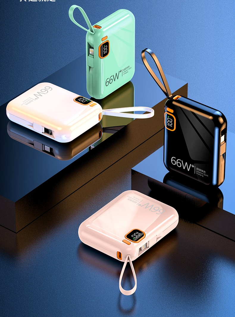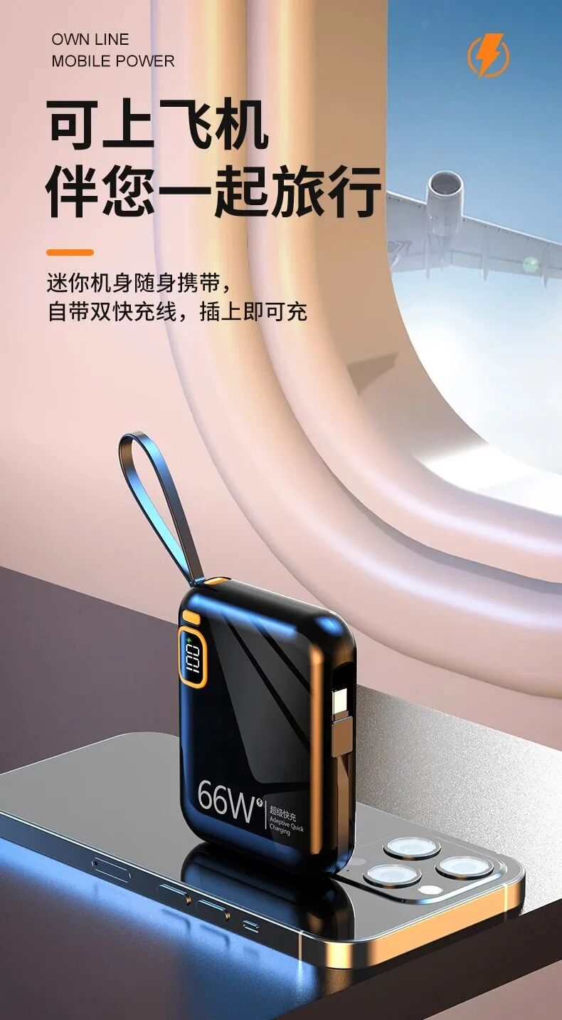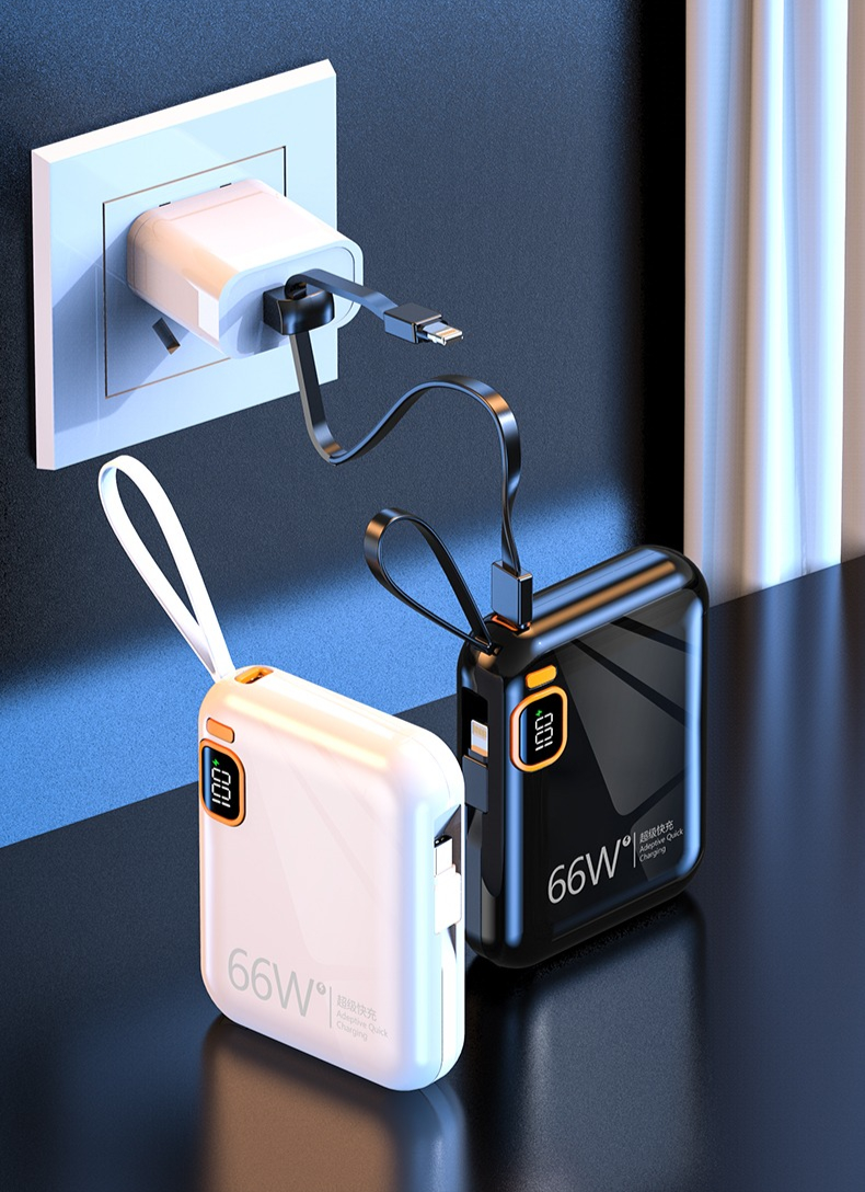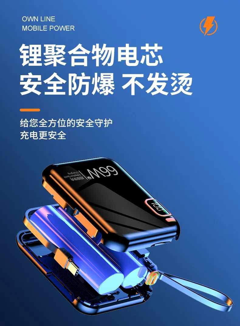 而它内隐藏着一根安卓Type-C数据线,一根苹果Lightning数据线以及USB接口,一次性满足不同设备的充电接口需求。需要用时,稍微用力一拉就弹出来,平时不用收起来即可,出门在外就能避免只带充电宝而忘记带数据线的尴尬。很多人都觉得移动电源的充电速度赶不上原装充电器,那是因为你没感受过快充!经过新科特实验室试验测试,华为P40只需要30分钟就能充85%电量。要知道普通的5V2A给华为P40手机充电30分钟只能充30%。当然充苹果手机也有快充,充iPhone13 30分钟可以充满75%,速度和原装充电器不相上下!并且系统兼容主流快充手机,还可以为平板电脑、数码相机、游戏机等智能设备进行快速充电。更赞的是不仅支持给手机快速充电,同时还支持给充电宝快速充电!这一点真的很省心的,出门完全不用带一大堆乱七八糟的数据线,直接拆下来就可以用给充电宝"加油"!超级快充 10000mAh大容量
