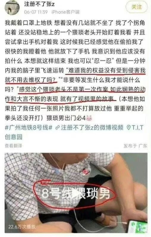 我戴着口罩上地铁,想着没有几站就不坐了,找了个拐角站着,还没站稳地上的一个猥琐老头开始盯着我看,并且尝试拿出手机对着我,这时候我已经感觉他在偷拍我了。很快的我瞪着他,他就放下了手机,我意识到他应该没有拍什么,本想就这样结束,我也可以“忍一忍”,但是一分钟内我的脑子里飞速运转“难道我的权益没有受到侵害我就不用去维权了吗?”“非要等发生什么我才能说什么吗?”感觉这个猥琐老头不是第一次作案,如此娴熟的动作和大言不惭的表现,就有了视频里的故事(本想他如果拍了我任何一张照片我都不打算放过他,重重举起的拳头还没开打)猥琐男出门必4。