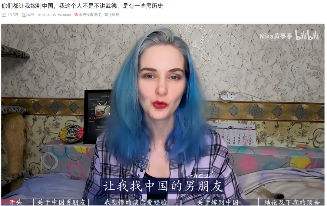 B 站有位俄罗斯博主 @Nika 黄亭亭,也结合过自己的感受聊过彩礼,快手创作者 @laowaiTV ,平时聊中外文化差异,学做中国菜啥的。虽然制作不算精良,可内容也算言之有物,可以管中窥豹生活差异。