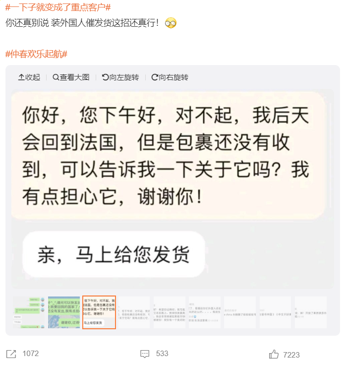 数月前小红书上还诞生了一波新玩法,商家发货慢?装成外国人一催,立刻就能得到 “ 下午发出 ” 的答复。